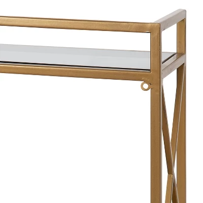 The beautiful, glam design and high-quality materials of this glam shelf from Kate and Laurel offer your home a perfect wall accent for storage and display. The Blex wall shelf has a sturdy, dependable metal frame with two tiers of inset glass shelves, providing a sleek accent to save your books, adorable plants, or even makeup and lotions. Each shelf can hold 15 lbs. worth of items and is 18 inches wide to provide enough space for all of your items. This shelf has an overall height of 15 inches, with 11.5 inches between each shelf to provide plenty of storage space. This shelf has an irresistible, glam gold finish, blending seamlessly into any glam decor aesthetic. Use the Blex wall shelf in any glamorously-styled living room, bedroom, bathroom, entryway, kitchen, or dining room. Its flat, clean lines make it excellent as a wall accent or in multiples stacked together as one multi-tier unit. There’s no assembly required and hangs in a matter of seconds with metal eyelet hangers.