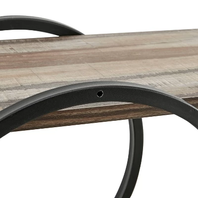Make a design statement with the Antigua Crossed Double Circle Shelf Unit. Simple and understated, this shelf unit features an industrial style with two levels of distressed wood finish laminate shelves held together by circular black metal frames. An effortless addition to all modern spaces, thanks to its sophisticated, pared-down design. Mount it in your living room or bedroom to store or display picture frames, books, vases, keepsakes, and collectibles; or use it to update your kitchen or bathroom décor while storing kitchen or bathroom supplies.