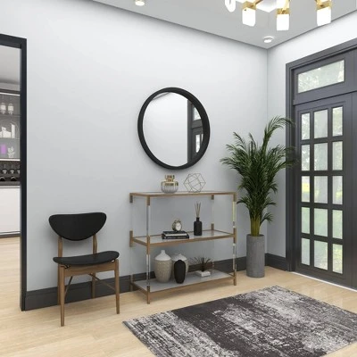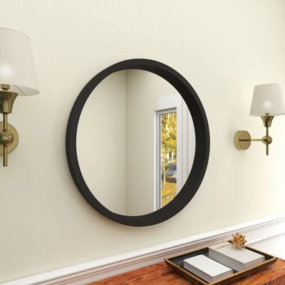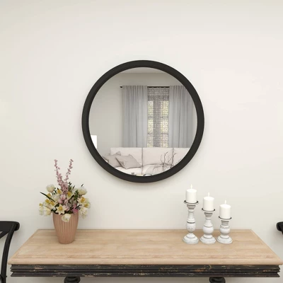 - •This contemporary wall mirror features a minimalistic black-framed round mirror design