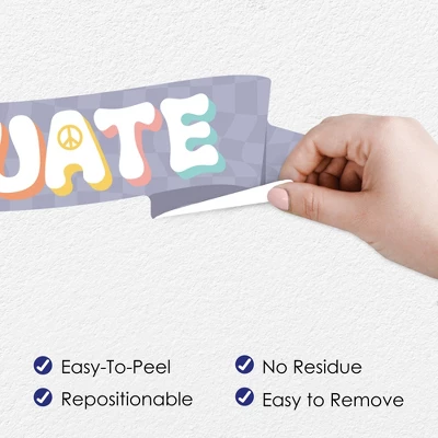 Groovy Grad Wall Decals Backdrop includes 1 sheet of vinyl wall stickers that include letters and shape pieces that form the perfect Congrats backdrop for your Hippie Graduation Party. Wall Decal sheet measures 50 inches wide by 16.5 inches tall. Pieces range in size from 30 x 6.5 inches to 3.25 x 3 inches. Effortless Decor: The Groovy Grad stickers are an easy DIY party decoration that will make a big impact at your celebration. Stick them on a flat wall surface to create that picture-perfect setting and then grab your camera to capture all the fun. Easy to Use: Groovy Grad vinyl decals are easy-to-peel and repositionable. Wall art stickers will adhere to various surfaces including painted walls, plastic, wood, glass, and metal. To use, make sure your surface is clean and dry. Slowly peel the sticker from the paper to avoid tearing and smooth over with your hand. They are also easy to remove, leaving no residue. High-Quality Supply: Groovy Grad wall stickers come with a quality matte finish and vibrant colors. They are printed on water-resistant professional quality material and will arrive on one full sheet rolled. Made In The USA: Groovy Grad Wall Decals are designed and manufactured at our Wisconsin facility using materials that are Made in the USA.