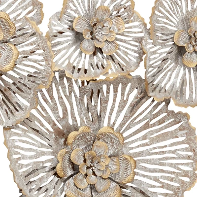 - Nine soft, light gray flowers staggered in size and layered over each other to create a dimensional floral wall art piece with pierced meal petals to create textural lines and gold accents on the petal edges