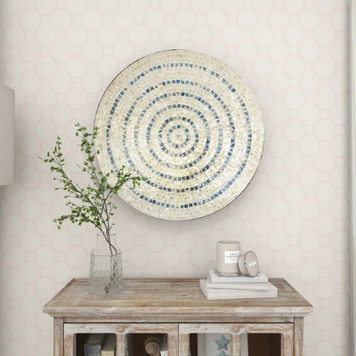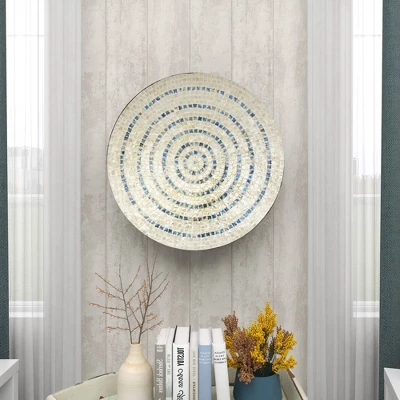- •This wall decor features circular patterns of mussel shell pearls materials and circular wood base