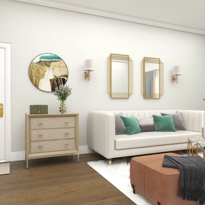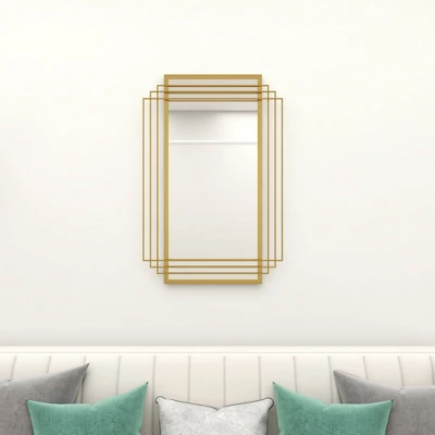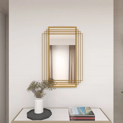 Apart from decorating your home, the purpose of this wall mirror is to bounce back outdoor light to a small room to make it look bigger. Pair this decorative wall mirror with house plants or other wall decor accent pieces to blend everything together perfectly. This gold wall mirror carries an affluent line outlay design best appreciated against a white background, on top of a console dresser inside a glam-themed interior. This item ships in 1 carton. Can be hung vertically using the keyholes on the back; nails and screws not included. Suitable for indoor use only. This item ships fully assembled in one piece. This is a single gold colored entryway mirror. Glam style.
