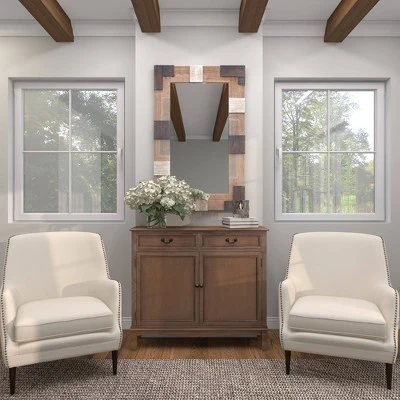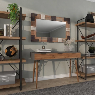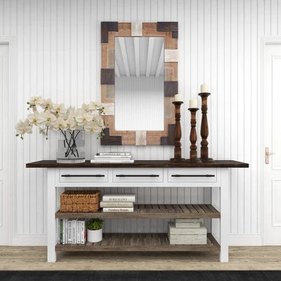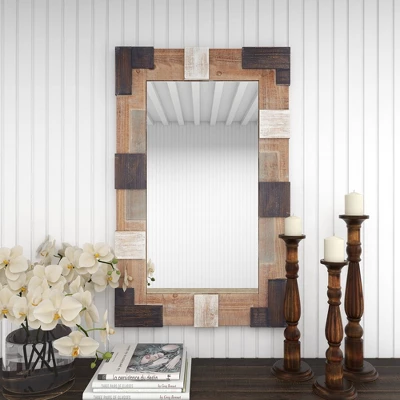 This wall mirror will work best in your farmhouse style inspired living room when displayed on walls with matching Decor. This item ships in 1 carton. Can be hung vertically using the D-rings on the back; nails and screws not included. Suitable for indoor use only. This is a single brown colored entryway mirror. Farmhouse style.