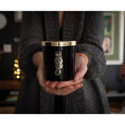 The symbol of the Death Eaters, of Voldemort and his followers, the Dark Mark on this Harry Potter Dark Arts Scented Candle glitters gold. This soy wax candle starts off with notes of dark fruit, lemon, crushed pepper, and apple blended with jasmine and Indonesian patchouli on a base of birch, black amber, oakmoss, and musk. The glossy black candleholder features an elegant illustration of the Dark Mark symbol with a gold lid. This candle is an intriguing combination of fruity and woody scents, appropriate to those who would use their time at Hogwarts to study the Dark Arts.