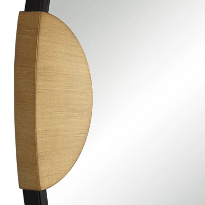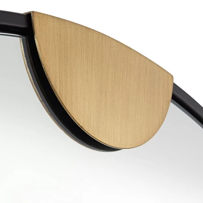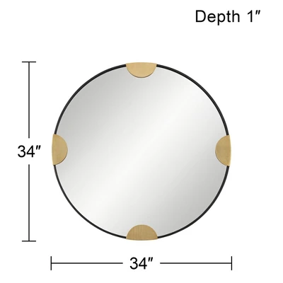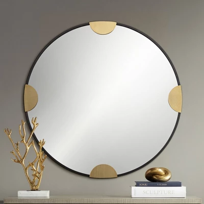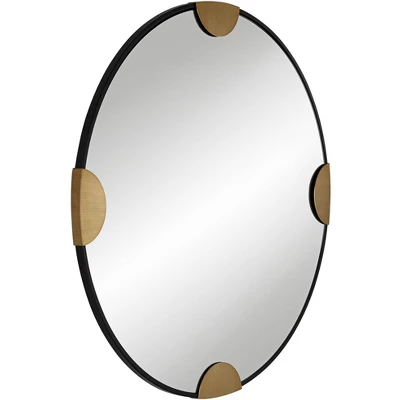 Blending artistry and function, this modern round wall mirror design is exclusive to Lamps Plus. From Uttermost, the mirror features a round glass set in a black bronze finish metal frame. Four half circle accents receive a gold finish and are stationed at the top, bottom, left, and right, adding the hint of an abstract compass rose. A striking choice that adds artistic ambiance in any room.