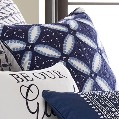 The Crewel Embroidered decorative pillow matches perfectly with the Homthreads Valentina bedding collection. This pillow is sized at 18x18in. and features a beautifully embroidered floral medallion pattern in navy and teal. The classy color palette makes this a versatile accessory for your bed, couch or favorite chair. The pilow comes pre-filled with a soft, luxurious feather inner.